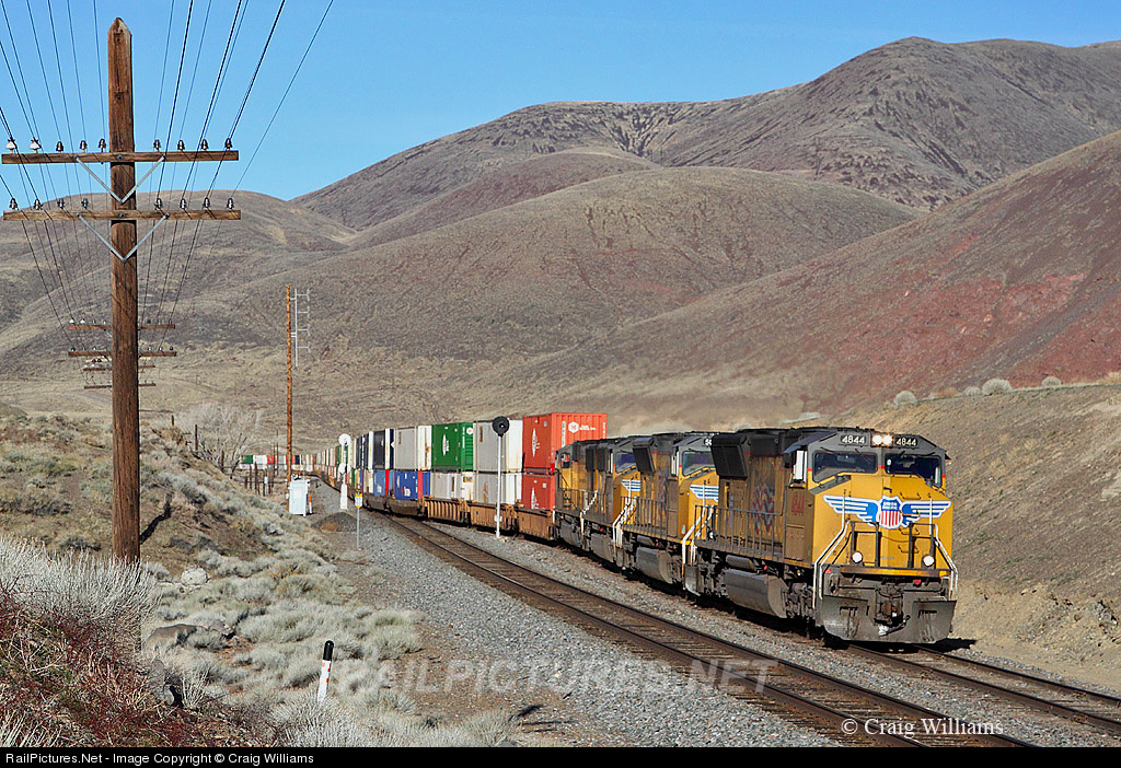 4 SD70's leads this Lathrope, CA, to Global 2 Intermodel Facility, IL, into the hole to meet Amtrak #5 at West Thisbe. Thisbe is located at MP 267, or 20 miles east of Sparks Yard. This area isn't the mountain area like west of Sparks on Donner Pass, but still has it scenic appeal. Here the elevation is still 4180 feet.
