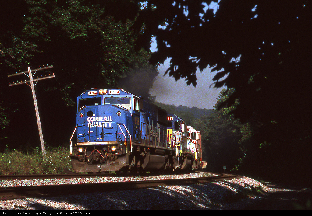 CSX's former Conrail SD60Ms and SD60Is were equipped with Automatic Train Control, compatible with that used on the former RF&P. This meant these units were good bets on the trains operating between Cumberland and Richmond. We were at Sideling Hill, WV on June 28, 2003 as the sun finally broke above the trees. Eastbound manifest Q415, enroute to Richmond and points south, rolls through the S-curve, led by former Conrail SD60I No. 8753.