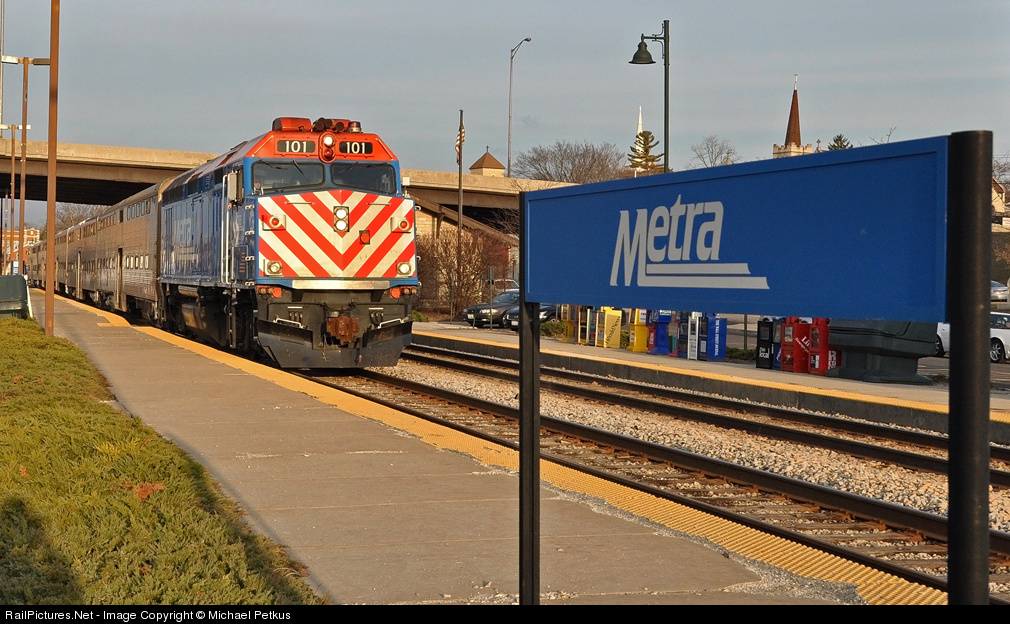 | Metra F40 #101, City of Joliet, rolls into the Lemont Metra Station before heading to its next stop in Lockport. |