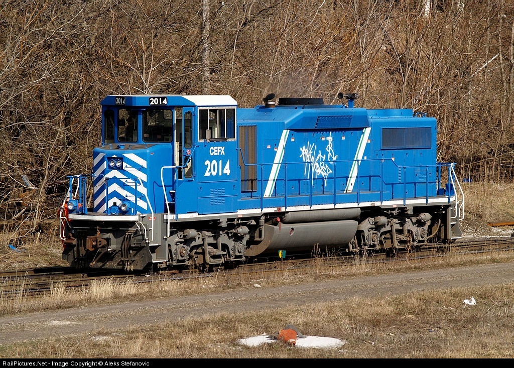 CEFX 2014 is one of a pair of units on loan to the SOR to test to determine if they want to lease them long term. This unique Cat powered loco is switching the yard at Hamilton.