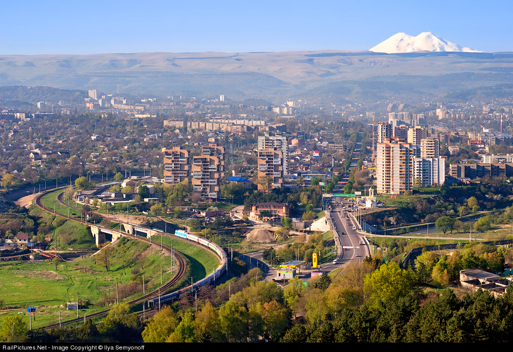 The train arrives to Kislovodsk city - one of the most sunny cities in Russia. On the top right you can see Elbrus Mount - the highest mountain in Russia and the highest mountain in all of Europe.
