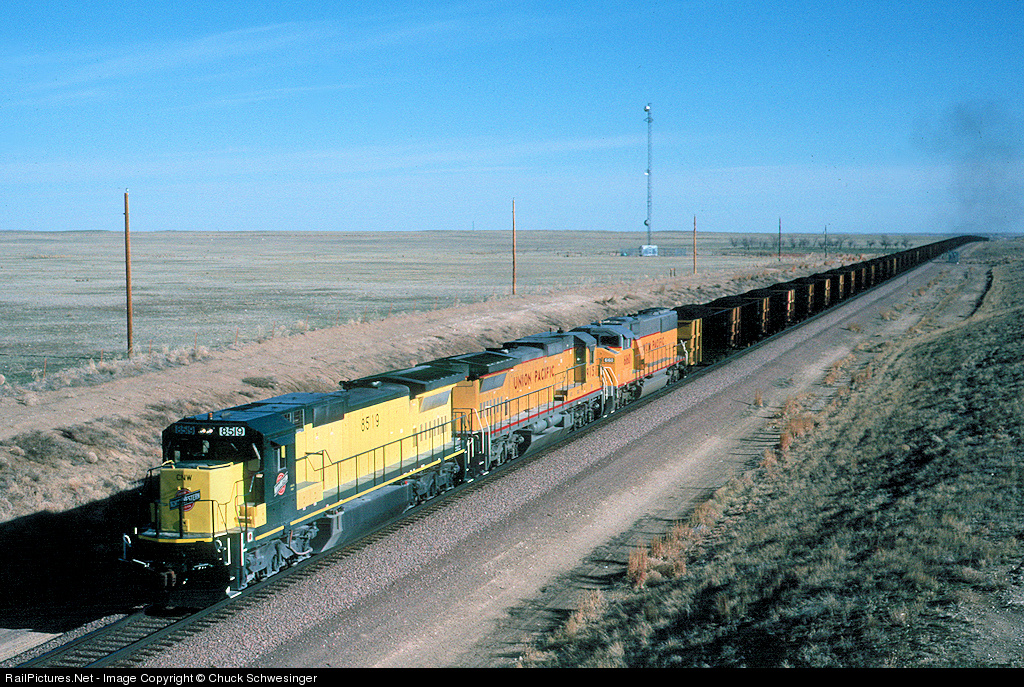 | CNW 8519, UP 9151, 6160 are cruising along at a pretty good clip as they start to pick up speed after dragging a coal load over a fair sized hump on the way to S. Morrill. |