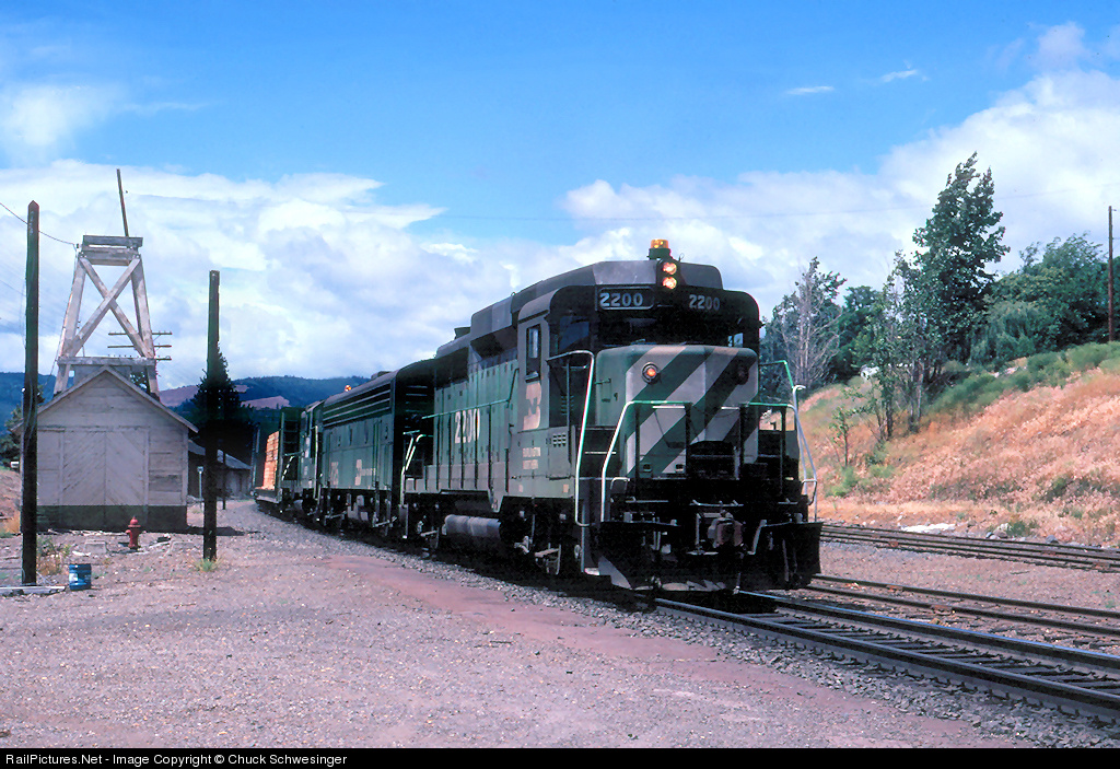 | BN 2200,725,1768 have paused at Lyle with train 182. The train is making a set out of a few cars along with GP9 1768 to be used on the branch line toward Klickitat and Goldendale. The station in in the left background, and the close building looks like a maintenance shed with a odd tower on top of it that maybe once supported a small water tank. The swaying trees to the right give nice evidence of the gusty winds that frequent the Columbia River Gorge. |