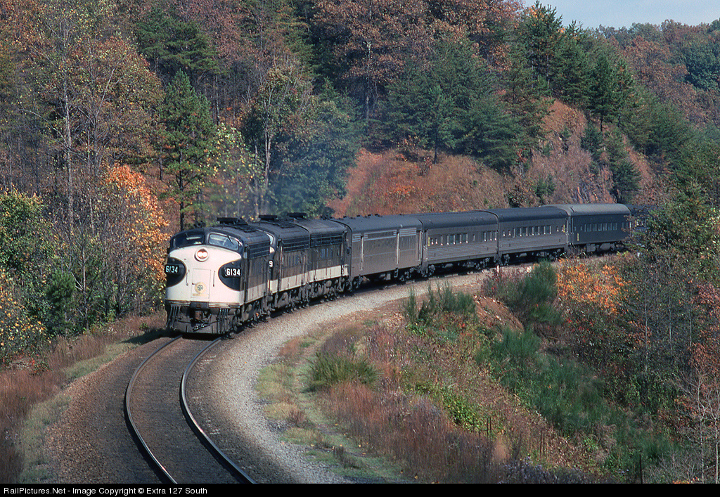 Southbound Southern No. 5, the "Piedmont," was rounding a curve at Rockfish, VA on October 18, 1975, led by FP7 No. 6134. Normally, No. 5 rated four F units, but on this day was getting along with three. The TOFC flats that made up the rear of the train are out of sight behind the hill.