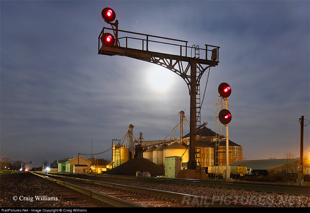 | An eastbound headlight illuminates the western horizon at 4 am. BNSF 7548 is on an eastbound bare table train that is about to break the quietness of this small town in western Illinois on the BNSF Transcon Mainline. Classic cantilever signals still protect this crossover 209 miles west of Chicago, IL. |
