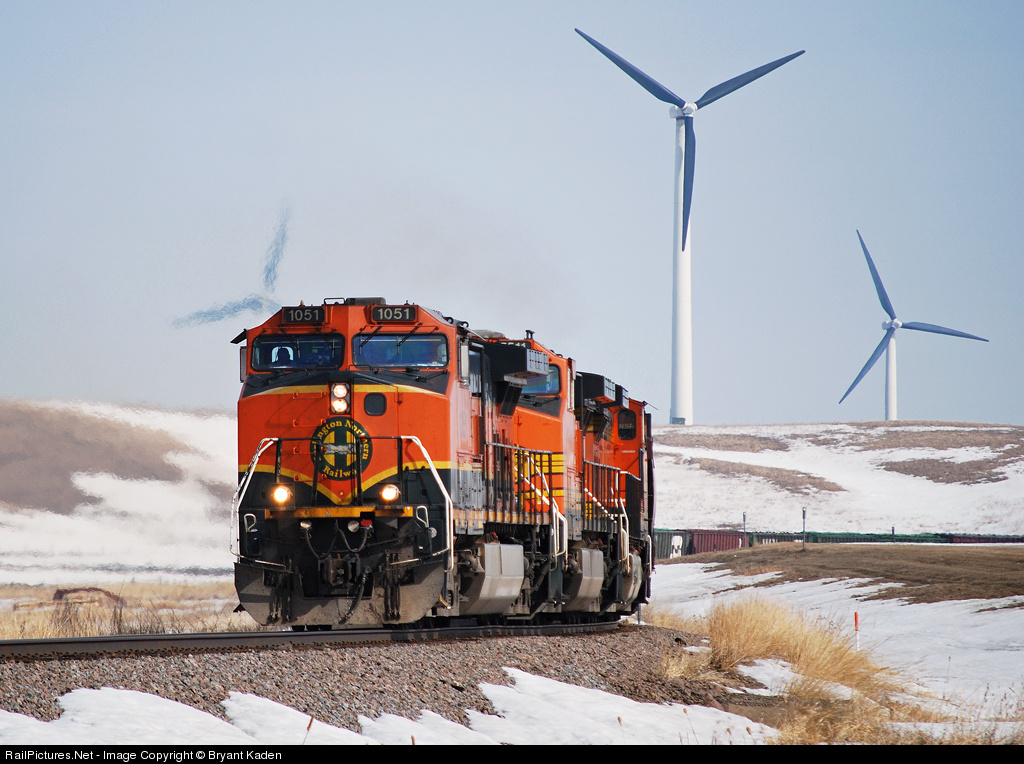 | On an otherwise cloudy day, the sun came out just long enough to find a southbound grain train passing the wind turbines as it curved through Buffalo Ridge just north of Holland, MN. Someone obviously felt an allegiance to the BN, as the "Santa Fe" on the 1051's nose herald is scratched out. |