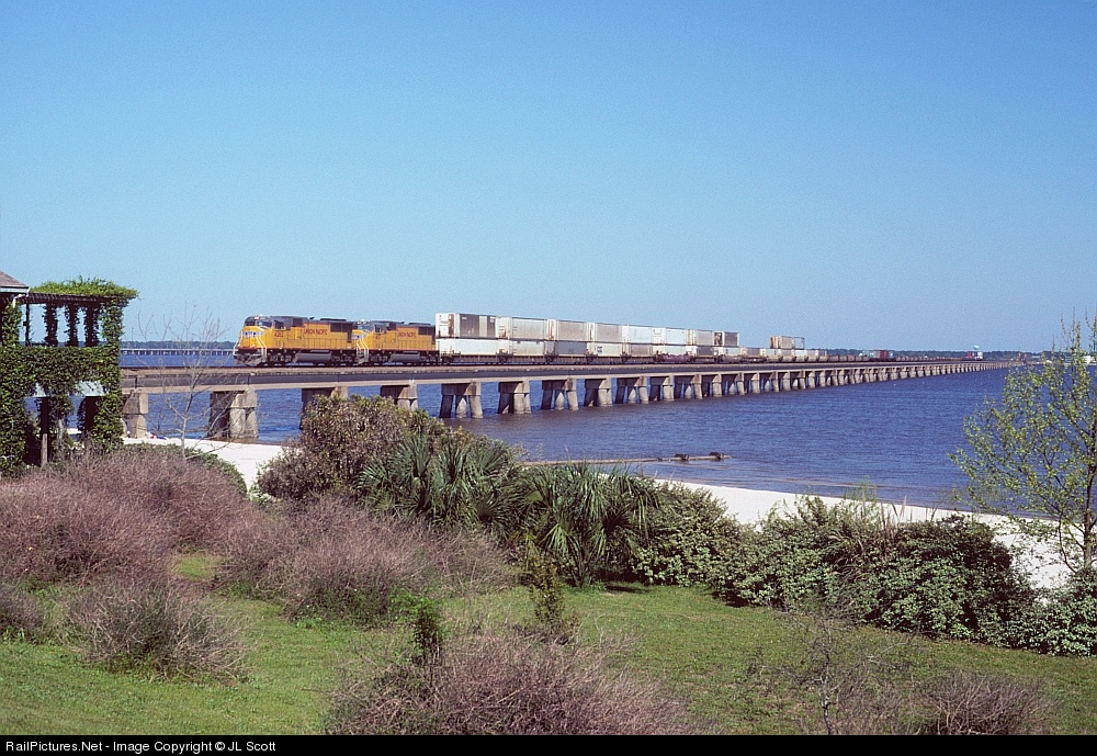 CSX Q145 crosses the Pearl River bridge as it heads west between Mobile and New Orleans. This shot was taken from the paradise gardens of my Bay St. Louis dream house. Judging by the pictures I've seen of the bridge, there's no way the little spot survived Hurricane Katrina.