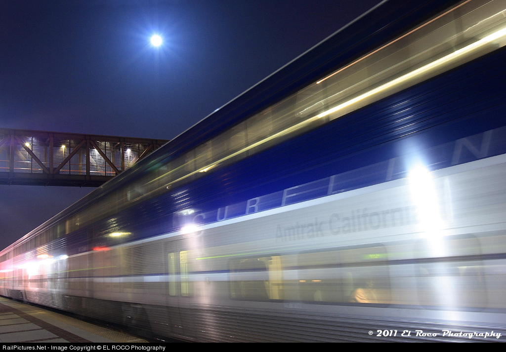 – Northbound Amtrak Train 591 pulls out of the station at Fullerton under a full moon, with the pedestrian bridge in the background.