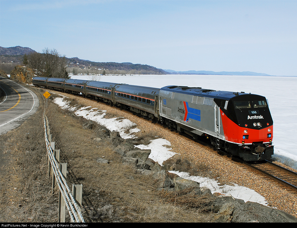 The 'pointless arrow' commemoratively painted Amtrak P42DC 156 made a round trip from Albany to Montreal on Saturday, March 19, returning on the southbound Adirondack train 68-20 Sunday, March 20. Train is seen rounding the curve along Lake Champlain on the former D&H territory in Port Henry, NY.