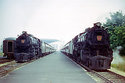 A couple of consecutively-numbered PRR K4's serving their last years in short-haul service are seen in this Ansco-Color view waiting at the Monmouth Park Race Track platforms. PRR and CNJ each ran two trains each day to the race park from metro NYC via the NY&LB. It is believed that the engine on the left is #3752.