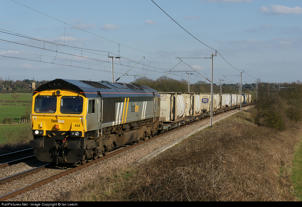 | DRS 66434,still in defunct Fastline livery,heads theTilbury to Daventry sugarliner passes Church Brampton on a glorious spring afternoon. |