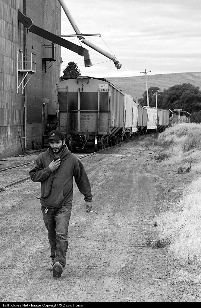 "Back ten to a hook." Joe, outfitted with the essential railroader accessories of steel-toe boots, switch keys, radio and lit cigarette, informs the engineer that it's safe to shove toward another cut of loaded grain hoppers. The location is the small elevator at Sunset, Washington, near the end of the Palouse River & Coulee City Railroad's PV (Pleasant Valley) Subdivision in the heart of the Palouse region.