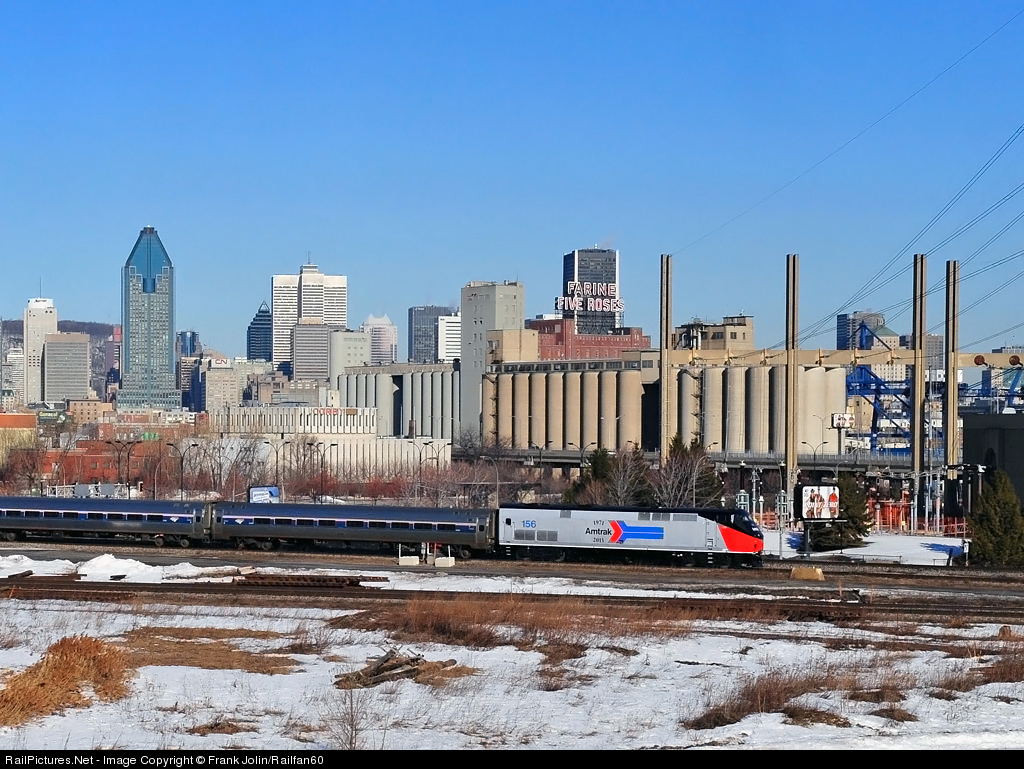 | Amtrak Adirondack has departed Central Station on time as it glides through Pointe St Charles with the Five Roses Flour neon sign in the background. A city landmark for more than 60 years. This is the location where steam locomotives were exchanged for electric locomotives for trains to and from Central Station.