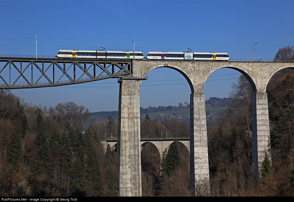 | Two articulated lowfloor trainsets "GTW" of Thurbo are forming the S 2 line from Herisau to Heerbrugg, crossing the highest railway viaduct (99 metre) of Switzerland near St.Gallen Haggen. In the background the 190 metre long doubletrack Sitter viaduct of the SBB line St.Gallen-Gossau-Winterthur. |