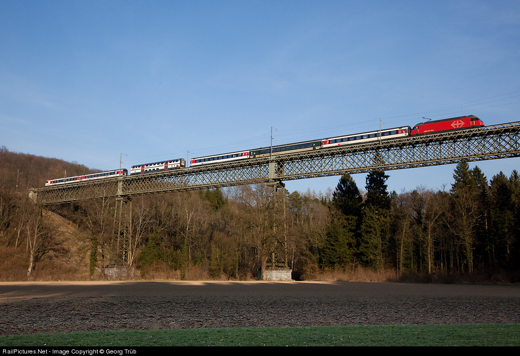 | Railway technology of the future crosses a viaduct from the 19th century. Test train for the WAKO cant compensation of Bombardier, scheduled for the ordered 59 doubledeck long-distance trains TWINDEXX RABDe/RABe 502, crosses the 330 meter long bridge (built in 1876) over the Thur between Ossingen and Thalheim on the line Winterthur-Etzwilen. |