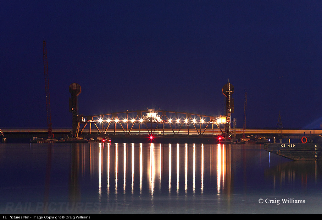 | Works still continues on the new drawbridge at Burlington over the Mississippi River. Here an eastbound coal load crawls over the bridge at 10 mph on its way east towards Galesburg, IL. This project replaced the bridge’s swing span with a new lift span over the navigation channel, and widens the channel thru the bridge from 150 feet to 307 feet 6 inches |