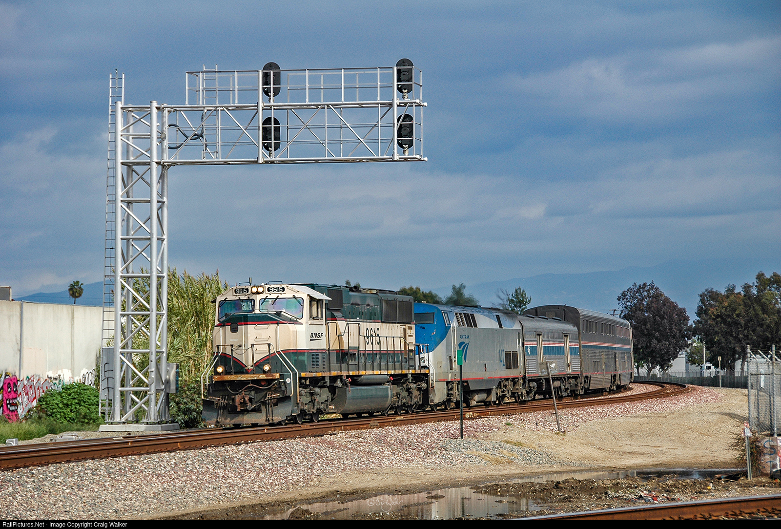 Rolling through Fullerton Junction 9 hours 20 minutes late, Amtrak train 4 (the westbound Southwest Chief) has had a number of setbacks on its journey from Chicago to Los Angeles. Among the problems was the addition of BNSF SD70MAC 9615 in La Junta, Colorado, because of ailing Amtrak P42DC 45 developed problems, along with slow orders through Kansas and Colorado due to signal problems (reportedly copper theft), and then setting out unit 45 in Albuquerque, New Mexico. The train was running so late at this point that a crew change was scheduled for Fullerton, the train's next-to-last stop and less than a mile ahead, with the new crew taking the train the final twenty-six miles into Los Angeles. (Fullerton, California – March 26, 2011)
