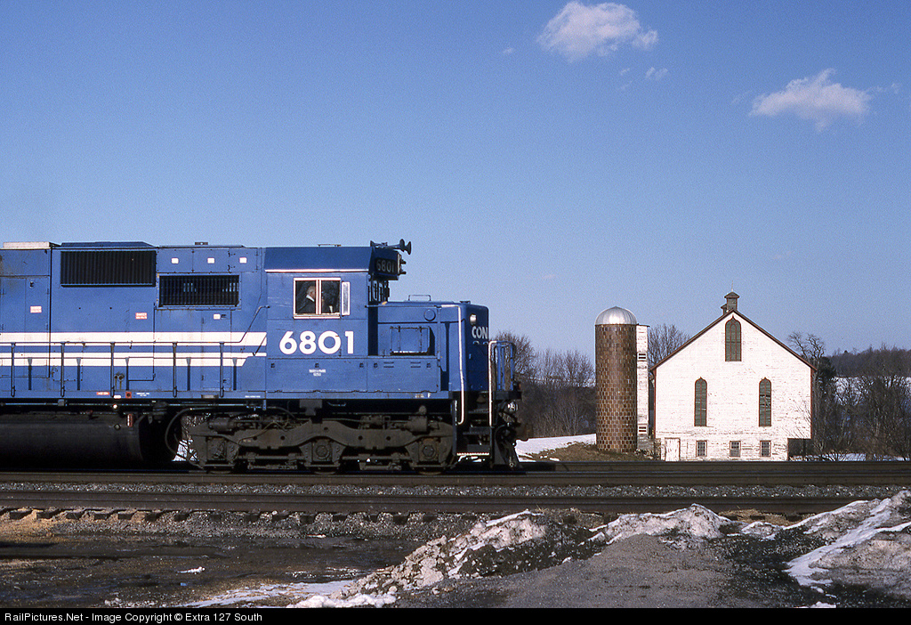 | Among the things that I have always liked about Pennsylvania are the barns. Many of them seem to be ornate and fairly well maintained, unlike some places where they are strictly utilitarian and in bad repair. I always thought this barn at Port Royal was interesting. An eastbound Trail Van train races by on March 19, 1994, led by SD50 No. 6801. |