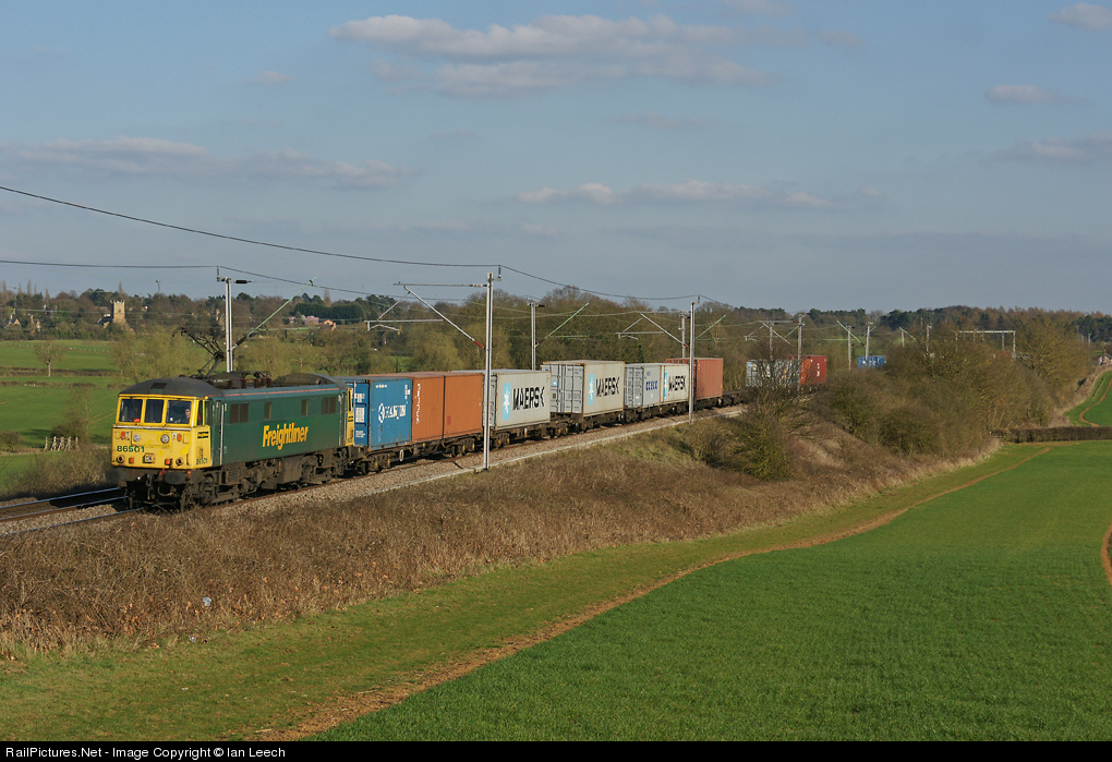 Freightliner 86501 on a Felixstowe to Crewe liner heads through the Northamptonshire countryside near Church Brampton.