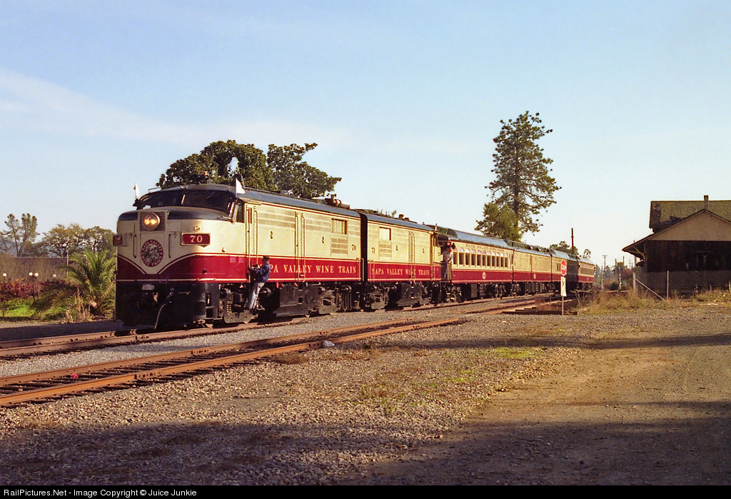 | The Napa Valley Wine Train is operated by the Napa Valley Railroad and runs between Napa and St. Helena, Ca., a distance of about 36 miles round trip. The route generally parallels California State Route 29 for much of the route. The line utilizes ex-Canadian National MLW FPA-4 locomotives for power with extensively modified ex-Ski Train coaches for passenger accommodations. After arriving at St. Helena, the crew prepares to cut off the locomotives and run around the train. |