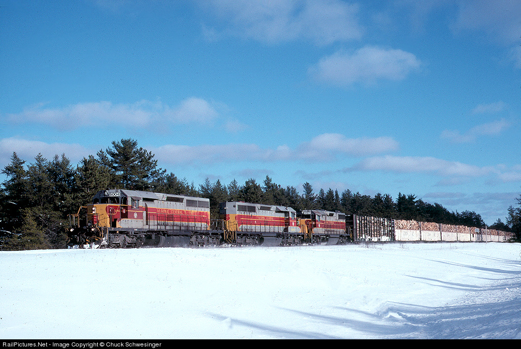 | A couple days before Christmas 1995 a set of all ex ACR units lead a late running 121 car train 34 at Nahma. 6004,6006,2001 are having a slow run from Sault Ste. Marie to Gladstone with this monster train. |