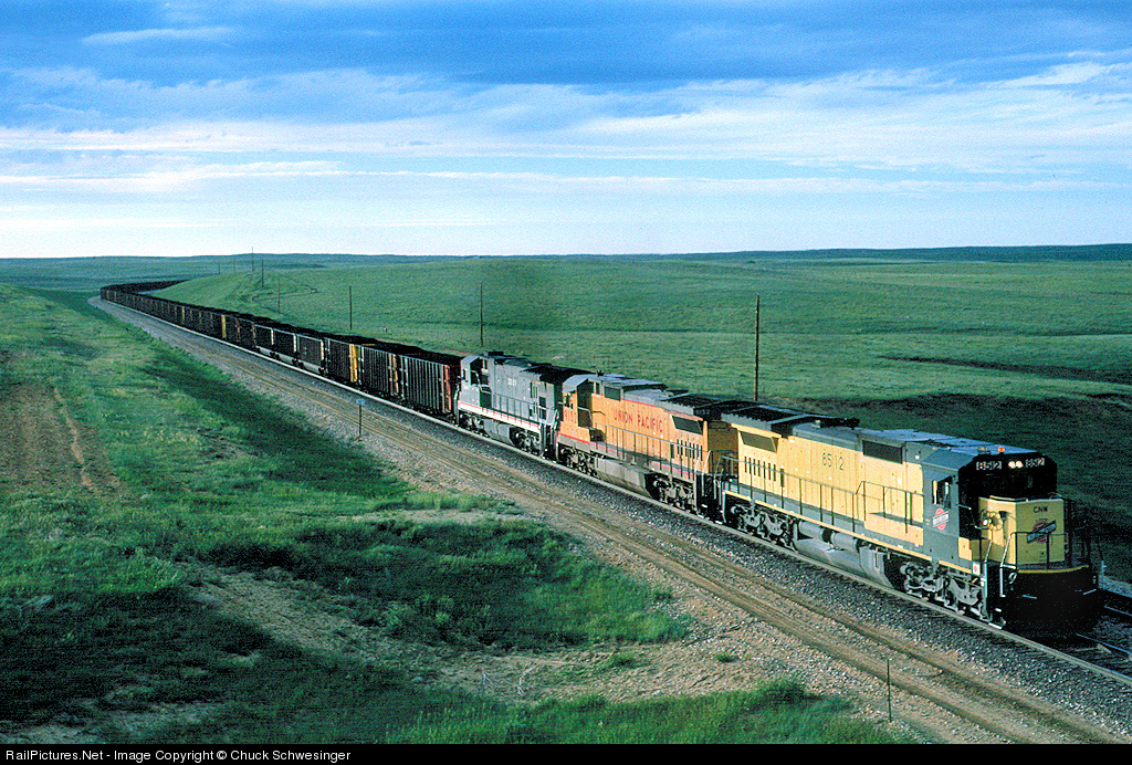 | Just at dusk CNW 8512,UP 9152 and GECX 3001 come pounding up Walker Hill with another load of Powder River Basin coal headed east. The lack of trees or anything else for that matter in Eastern Wyoming made late evening shooting easy. |