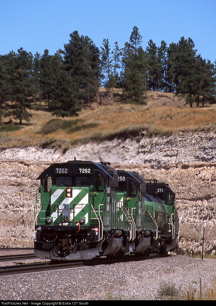 A BNSF light helper set drops downgrade at Belmont, NE on Sept. 10, 2000, after shoving a unit coal train up Crawford Hill. There were three helps sets in use at the time, two with four SD40-2s and a fuel tender and one with two SD70MACs and a fuel tender.