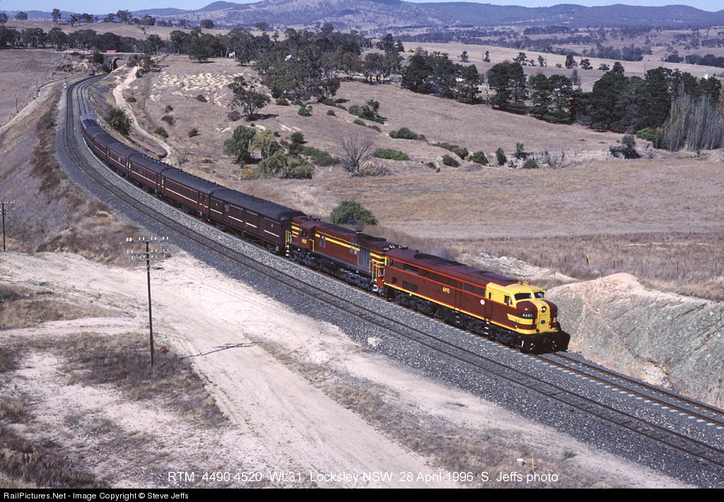 Two preserved ex NSWR Aussie Alco units 4490 and 4520 work tour train WL31 west through Locksley