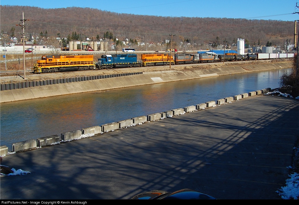 | The SIJB finishes its switching duties at Foster Brook, and continues south along the East Branch of the Allegheny River past the Bradford crew terminal. Note behind the tanks, the power for the Bradford Local waiting for the SIJB to clear the yard limits so it can start its day's work. Also dead in tow today are 2 QGRY locos headed to Butler for some sort of over haul. |