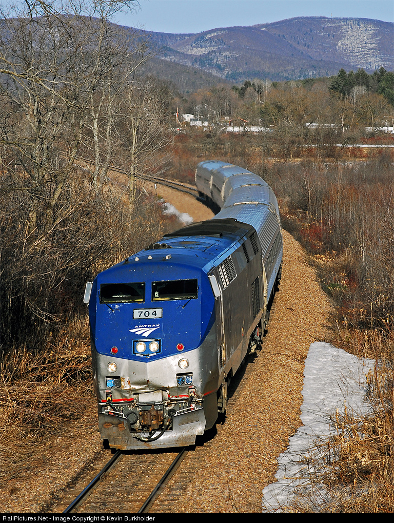 | The Sunday afternoon version of Amtrak's Ethan Allen train 296-27 from Rutland, Vermont, is seen leaving the Green Mountains in the distance as it heads east over Vermont Rail System's Clarendon & Pittsford subsidiary and ultimately for New York City behind P32ACDM 704. |