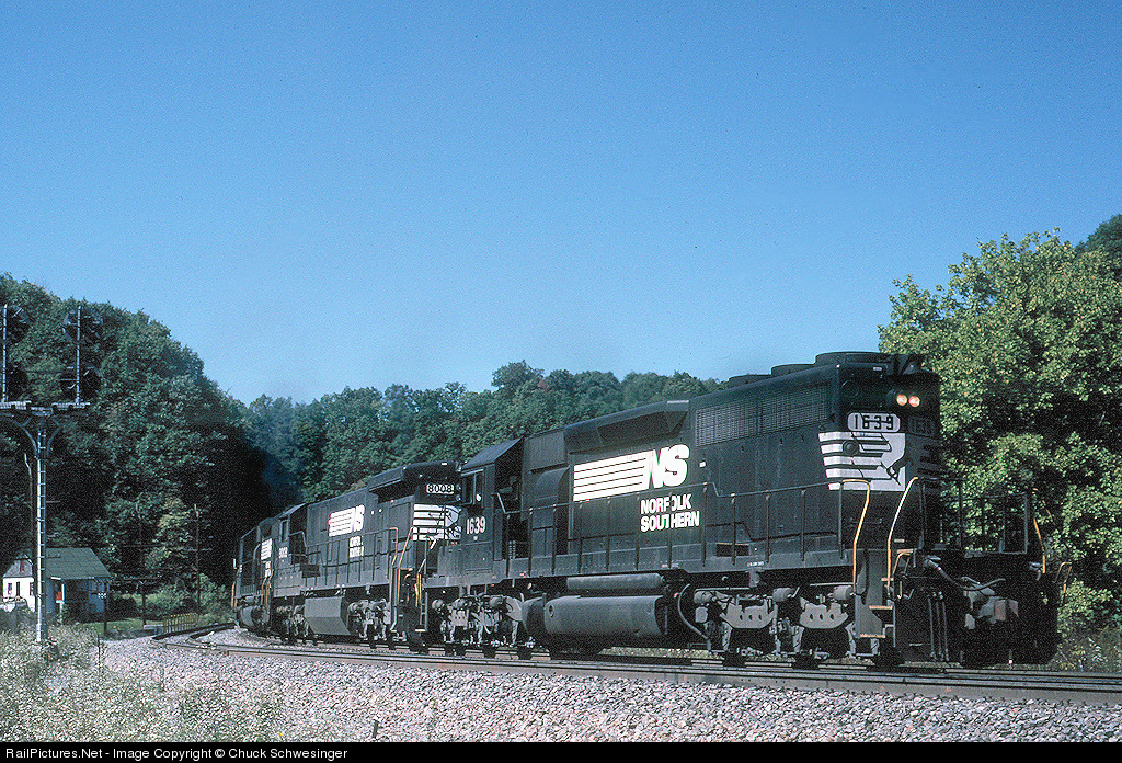 NS 1639,8008,1596,8567 scream around a tight curve near Bluefield with coal loads. At the time with units running long hood in front and all the steam era facilities still scattered along the right of way, the old N&W lines seemed somehow stuck in time.