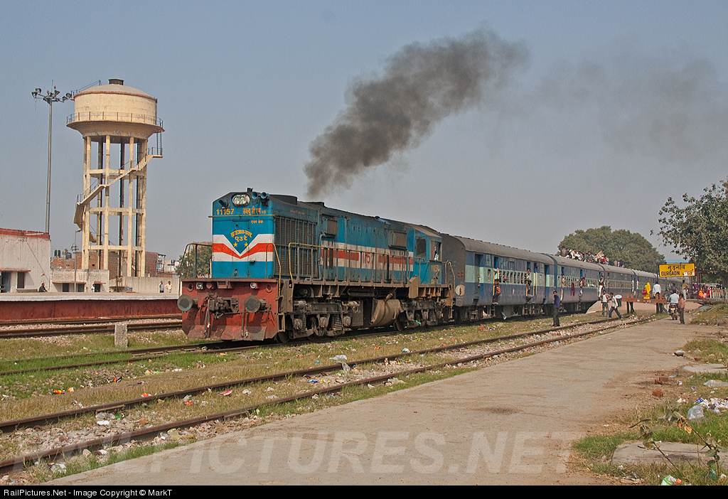 | Even on half power, its ALCO heritage is obvious as 11157 smokes out of Gurgaon with the Bareilly to Bhuj Ala Hazrat Express. Just days earlier 15 people had died riding on the roof of a train around Bareilly, but that doesn't seem to have stopped them! |