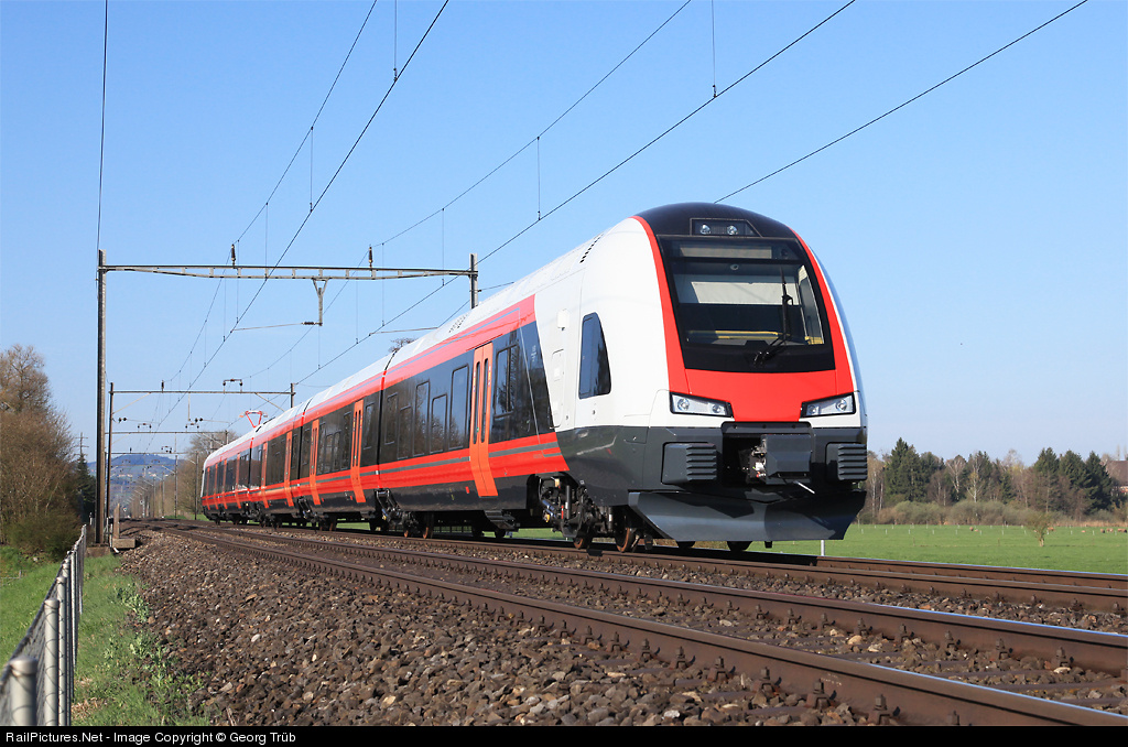| "Flirt" typ BM 74 from StadlerRail for the norwegian NSB on a test run between Sulgen and Erlen. The 5 car articulated lowfloor trainsets are capable for 200 km p.h. Stadler will deliver 50 of this 4500 kW trains in two different versions. |