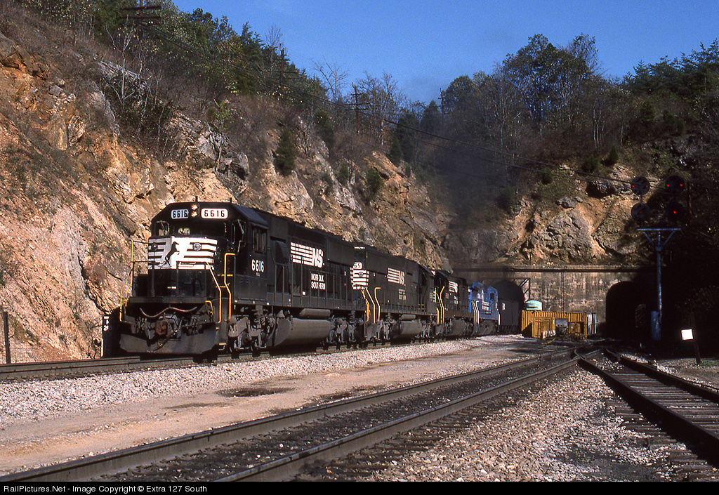 | A westbound NS empty hopper train was climbing out of Montgomery Tunnel at Montgomery, VA on Oct. 20, 1990, led by SD60 No. 6616. |