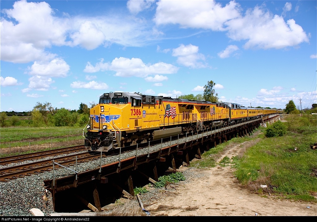 | On a partly cloudy day in Northern California, UP 7386 and the long, 18 car special race through Davis, CA and across the wooden trestle I have deemed "West Bridge". This train successfully traveled through the Feather River Canyon earlier that morning and would soon be seeing large sea boats along the San Pablo Bay. |