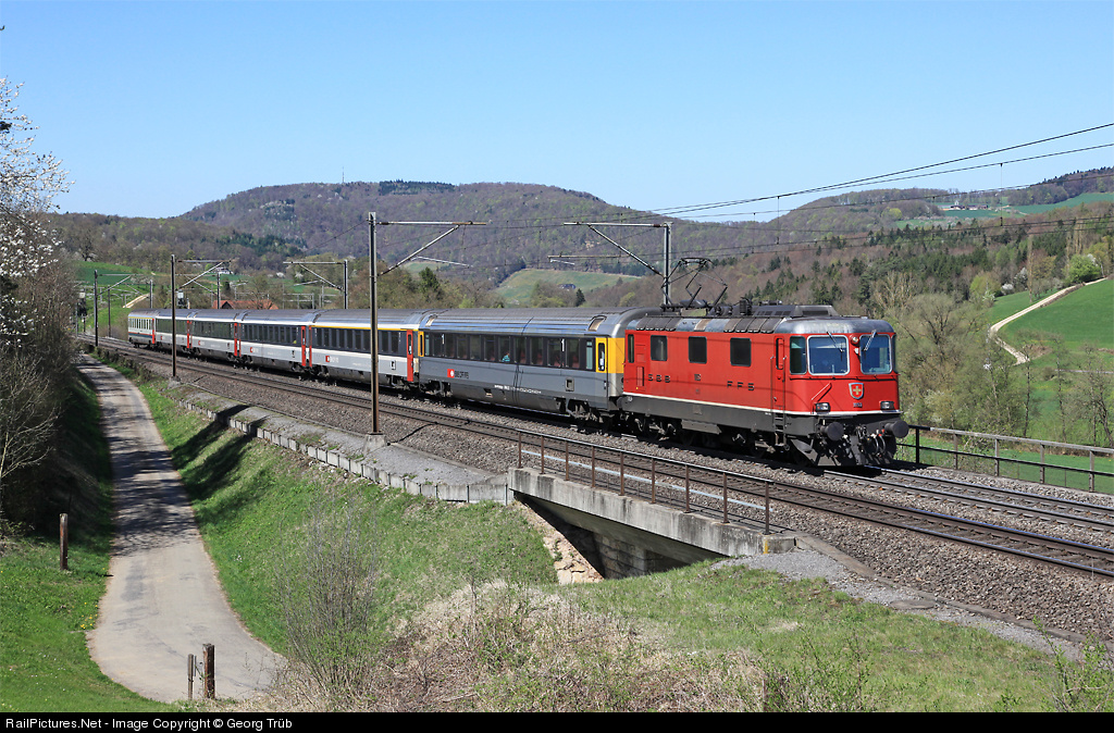 | Re 4/4 II 11153 (first series) pulls Inter Regio 1975 Basel - Zürich on the Bözberg line between Frick and Effingen. The first EC Apm car is in special colors from the former service in Cisalpino Eurocity trains. On the rear of the train a Bm I 11 car of the belgium SNCB. |
