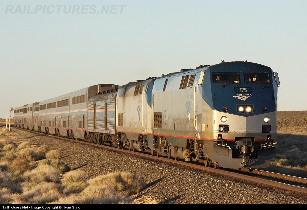 | Amtrak 175 sprints across the Mojave Sub in the late afternoon light of April 10th 2011. The detouring Starlight will soon be sailing along the floor of the Antelope Valley as it heads for LA. |