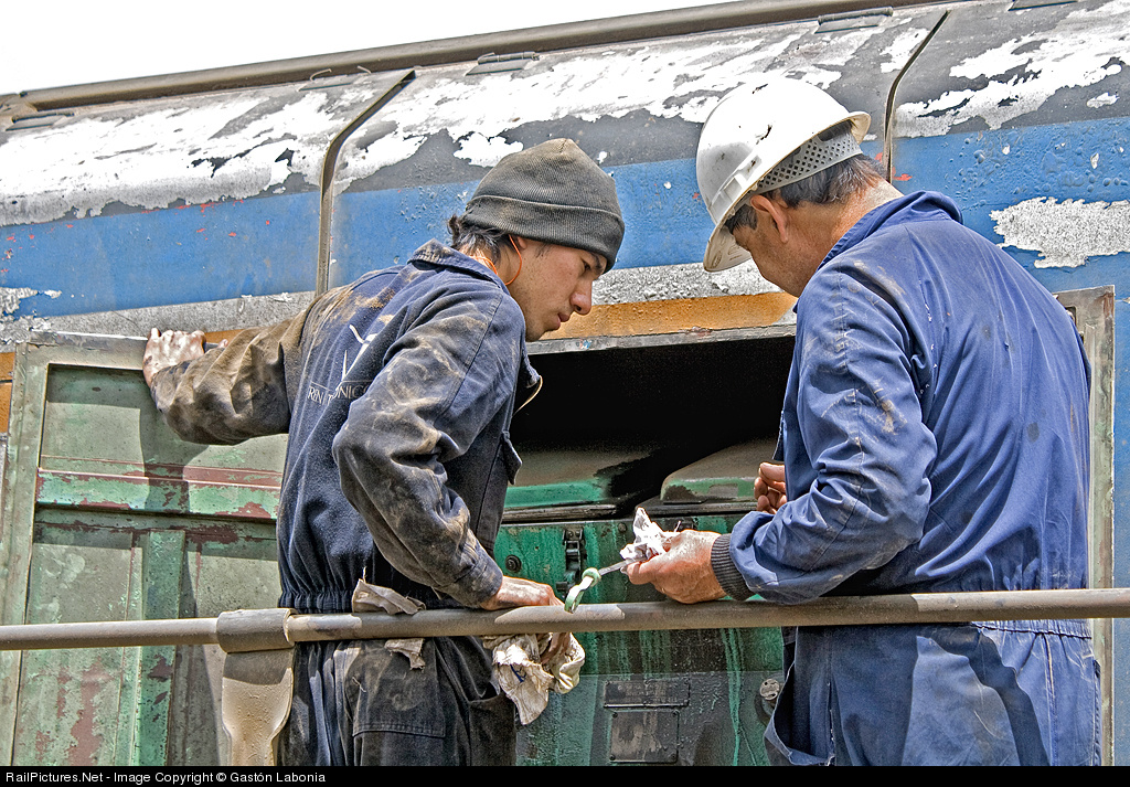 Tren Patagónico mechanics checking engine oil after the train arrival. Later they add 50 liters of oil to the engine.