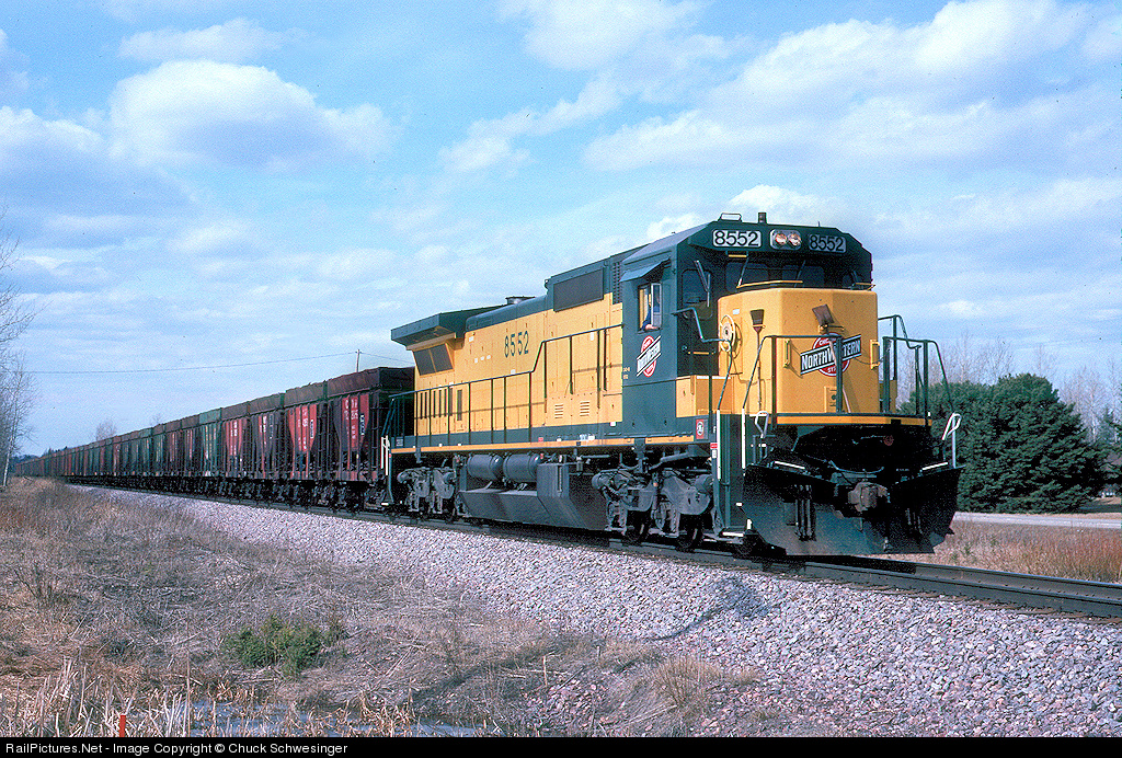 CNW 8552 rolls ore loads east at Rock. A Locotrol equipped C40 is pushing on the rear. This was quite a change from operations of a few years earlier when these jobs were powered by trios of C628's, SD40-2, or pairs of SD60's, SD50's, along with a SD45 or SD40-2.