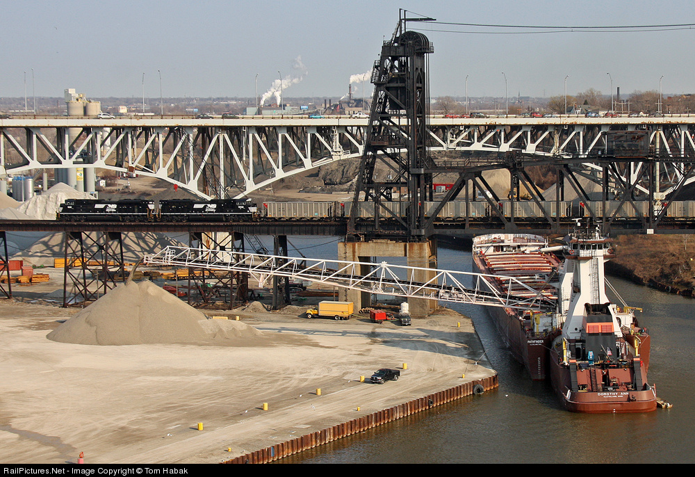 555 rolls over Drawbridge with brand new ACe's 1012 and 1002 in charge. Underneath tug Dorothy Ann and barge Pathfinder unload stone in the Flats.