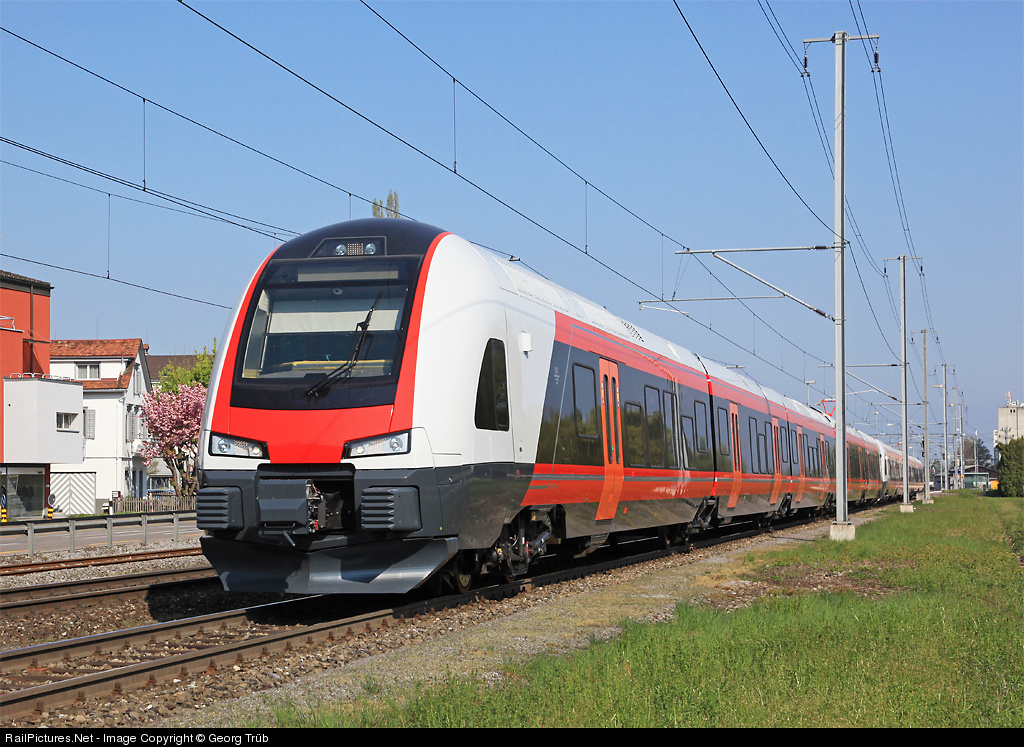 | One of the first test runs in multiple unit of the new BM 74 "Flirt" trainsets of StadlerRail for the norwegian NSB. BM 74 003 and 002 are speeding through Rheineck between Rorschach and St.Margrethen. |