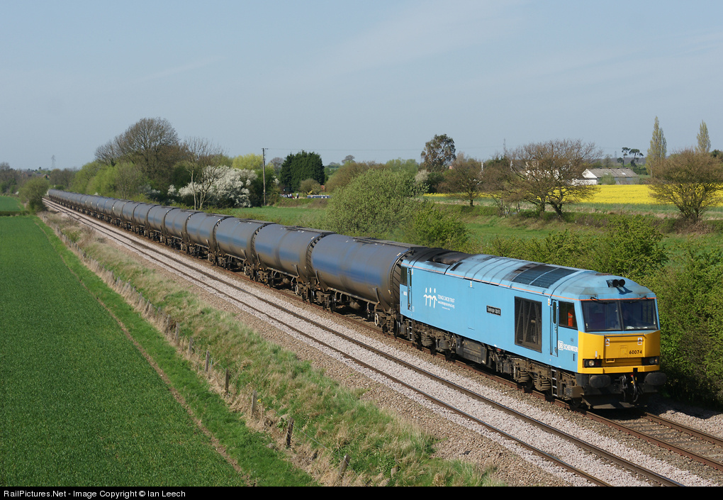 60074'Teenage Spirit' heads the Kingsbury to Lindsey empty fuel tanks passed Barrow on Trent.
