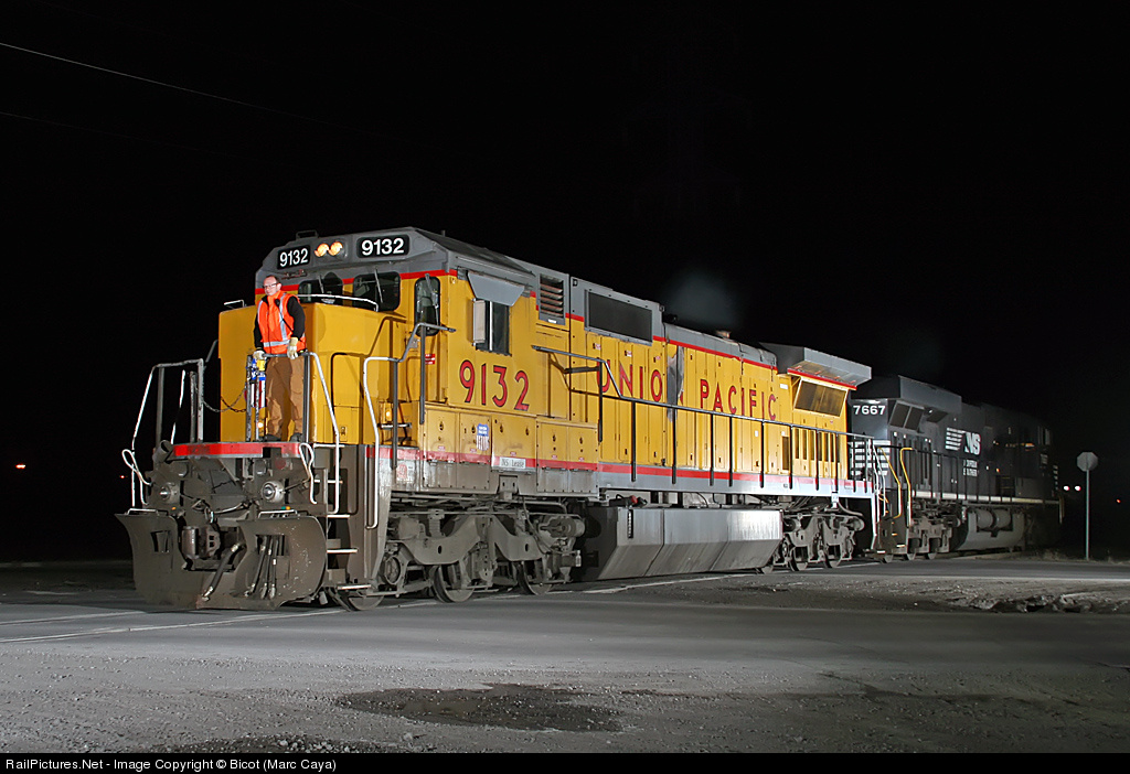 On NS lease, I wouldn't be surprised if this old warrior was put to rest in the near future... While the (female) engineer is sitting in the NS black loco, a conductor is standing on the porch of 9132, indicating the distance remaining to the CN-MMA interchange to do it's nightly pickup. Special thanks goes to Sandrine, my youngest daughter for helping me out for the swift flash setup!
