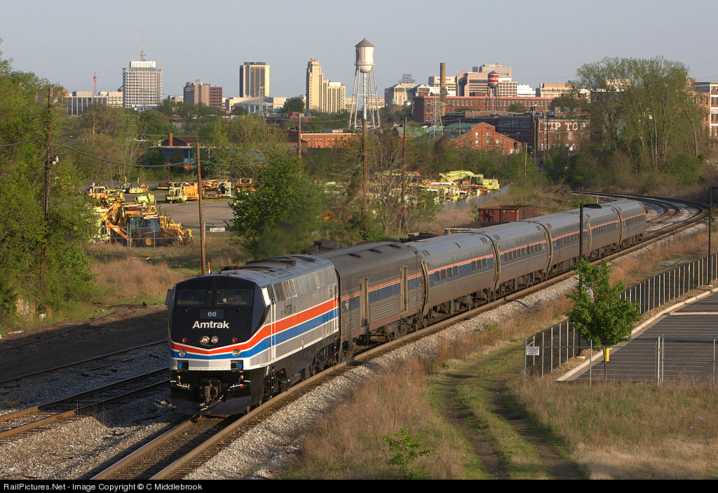 | Amtrak Heritage Phase II Engine #66 on Amtrak Regional Train #66 which originated in Newport News now passes through Richmond, VA with its next stop at the Staples Mill Road Station. April 2011. |