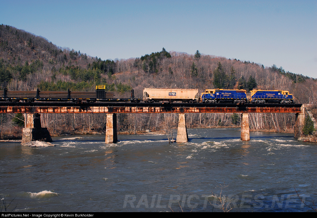 Who would have thought that a nearly complete ex-ICG train would have been working in Vermont in 2011? New England Central's Rail Train 6 is southbound laying the 115-pound welded rail crossing the Winooski River at North Duxbury, VT with NECR GP38AC 3857 (ex-NECR 9549, exx-IC 9549, exxx-ICG 9549, nee-GMO 730) and GP38 3855 (ex-NECR 9537, exx-IC 9537, exxx-ICG 9537, nee-GM&O 718) leading the TYOX rail train that is also former ICG!