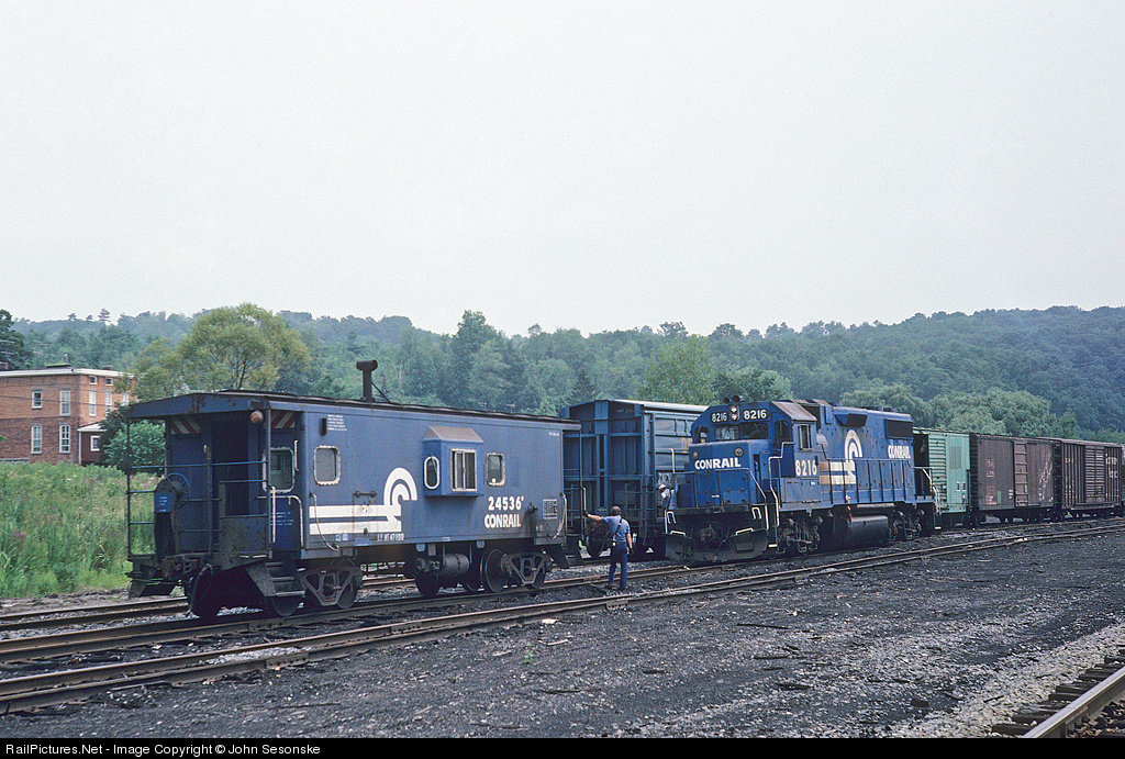 Conrail local works the Fonda, Johnstown, & Gloversville interchange yard in Fonda, NY. In the foreground is a class N-12 baywindow, CR 24536. There were 50 of these were built for Penn Central in 1970-1971 by International Car.