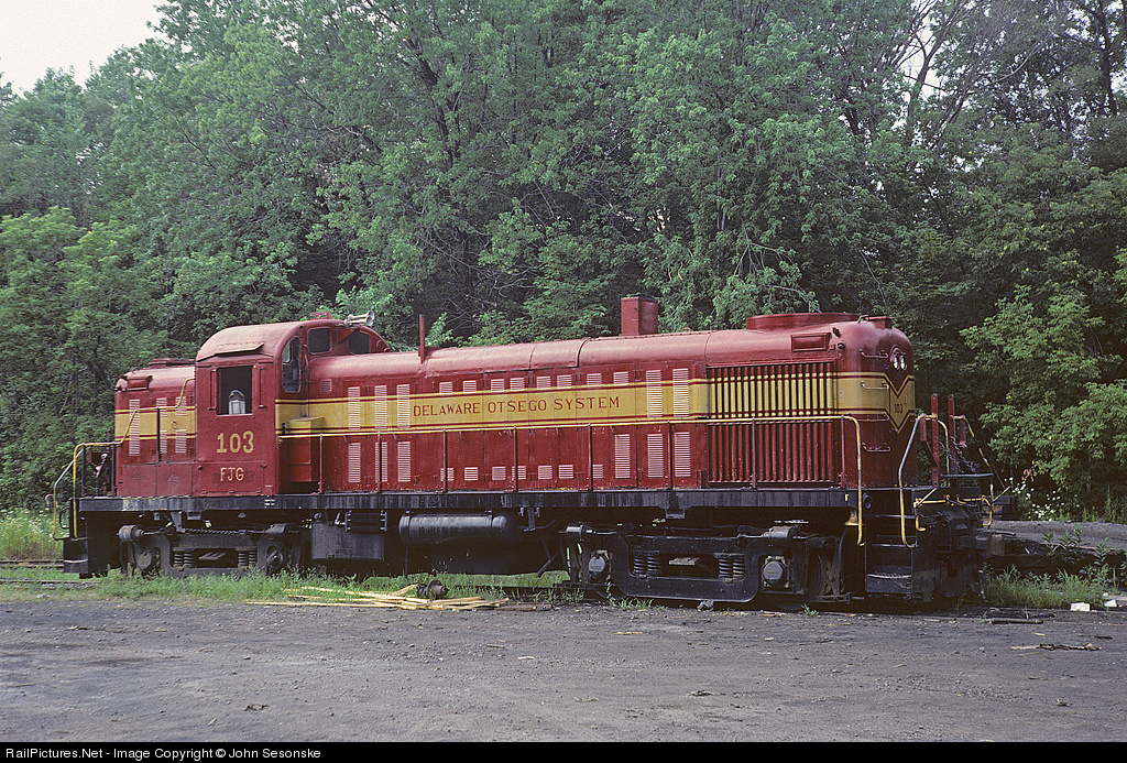 FJ&G 103 rests on the west side of the Gloversville Yard between runs. This engine was originally Reading 492, built June 1952, builder number 80110. It was sold to United Railway Supply and ended up as Roberval & Saguenay Railway 31. In 1979 it was acquired by Delaware Otsego as their number 103, first as LASB and then as FJG. This unit is currently part of the URHS collection, restored to Reading 492. Athearn produced an HO model of this as LASB 103.