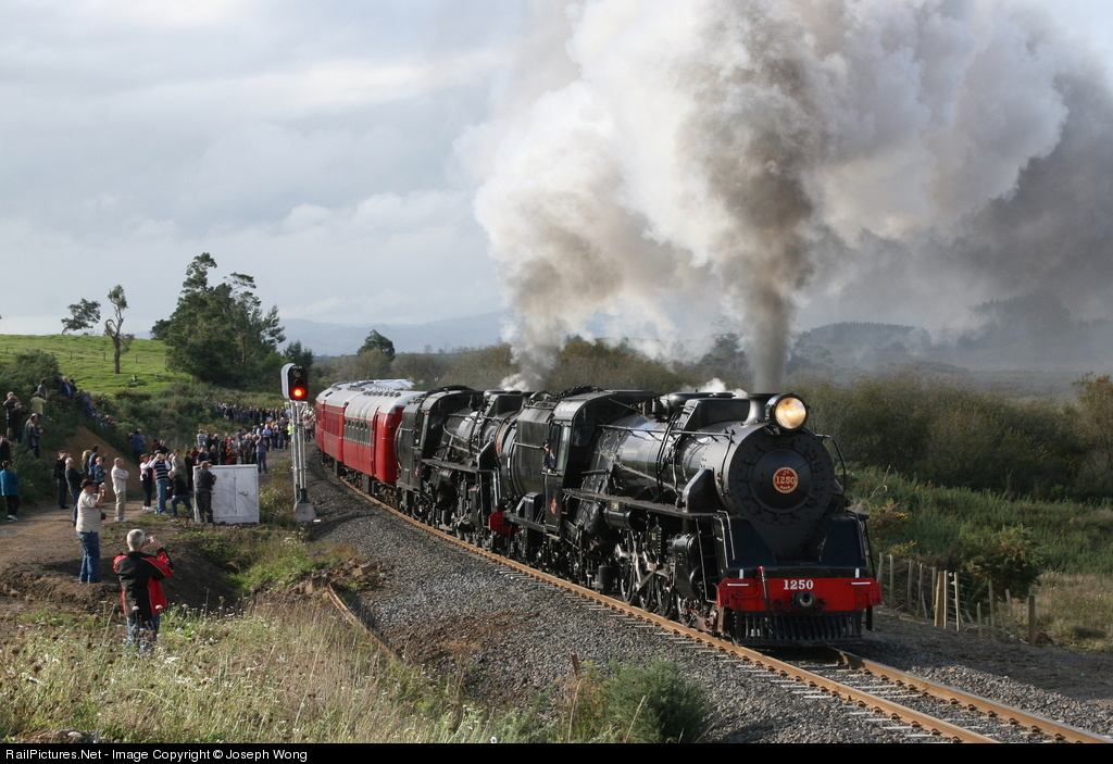 An 2011 Easter joint venture special between the Railway Enthusiasts Society's Glenbrook Vintage Railway and Steam Incorprated with a Historic moment with a number of "firsts": First doubleheader of Ja Class locomotives post preservation (Glenbrook Vintage Railway JA 1250, and Steam Incorporated JA 1271), first venture of JA 1250 onto the main line post recertification, first picture of JA Class 1250 on railpictures.net, and the first venture of Glenbrook Vintage railway's yellow vintage coaches onto the mainline following preservation. Her she is depicted during a special photo opportunity thundering down the north island main trunk following stopping, disembarking passengers, backing up the main line, and now thundering down the line. Following this, she backed up again to pick up all the passengers.