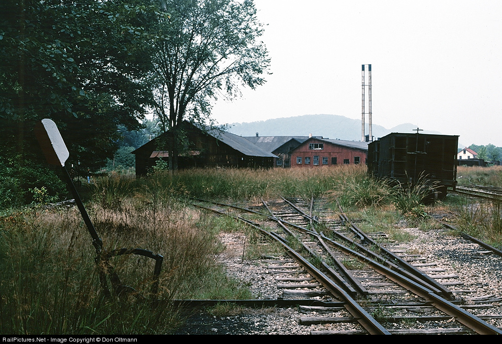 Stub switch, shop buildings and old hopper car lie in the weeds at Orbisonia.