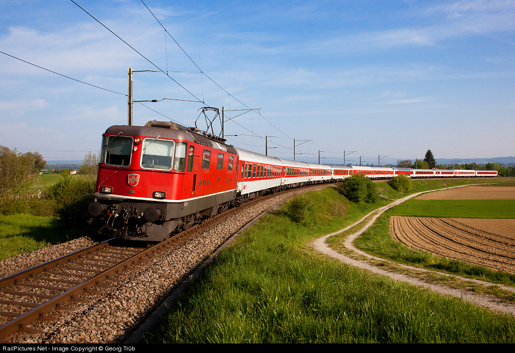 | Diverted "City Night Line" overnight train 489 KOMET of the DB AG, pulled by locomotive Re 4/4 II 11134 (first series), on the route through the "Weinland", from Schaffhausen via Andelfingen to Winterthur. The train from Hamburg was diverted due to construction work near Rastatt (Germany) via Stuttgart-Singen-Schaffhausen to Zurich. |